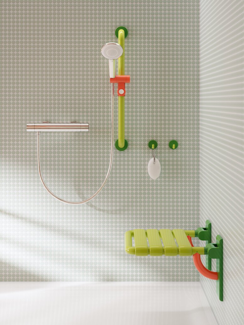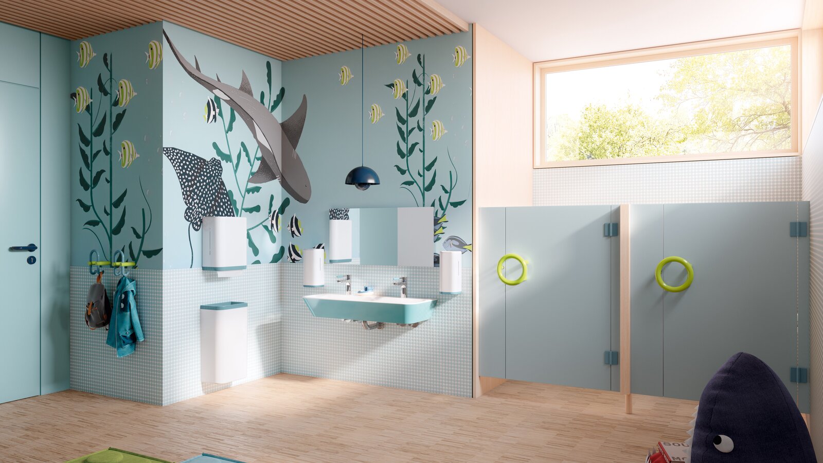 Deshalb fordert die VDI-Richtlinie 6000 Blatt 6 eine "funktionstüchtige, praktikable und visuell ansprechende Ausstattung" für Sanitäranlagen in Kindergärten, Kindertagesstätten und Schulen. Anstelle eines Sanitärbereichs mit klinisch weißen Wänden, Waschbecken und silbernen Armaturen, kommen in diesem Umfeld idealerweise akzentuierte Badeinrichtungen im kinderfreundlichen Design zum Einsatz: Eine WC-Spülung mit einer auffällig bunten Taste, ein WC-Bürstenhalter mit einem andersfarbigen Griff sowie bunte Hebel an der Armatur signalisieren den Kindern, wo sie ansetzen müssen, um die gewünschte Funktion zu nutzen.