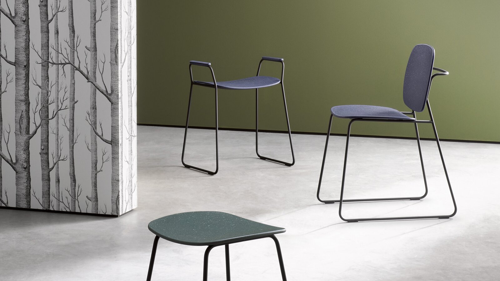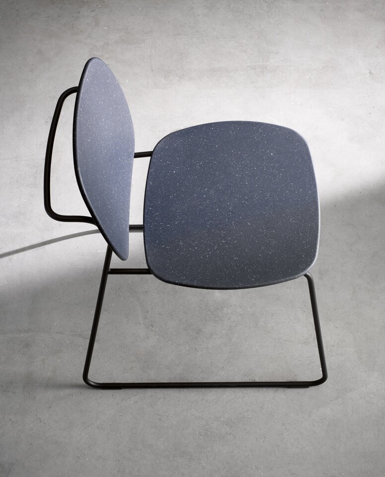 Susan Herrmann: Unsere Re-Sitzfamilie basiert auf einem filigranen Rundrohr-Design aus Metall, das wahlweise schwarz pulverbeschichtet oder hochglänzend verchromt ist. Die Sitz- und Rückenflächen sowie Armlehnen bestehen bei der Re-Sitzfamilie wie bereits gesagt aus dem Post-Industrial Rezyklat, das jedes Badmöbel zu einem Unikat macht und die größte Besonderheit der Produkte darstellt.