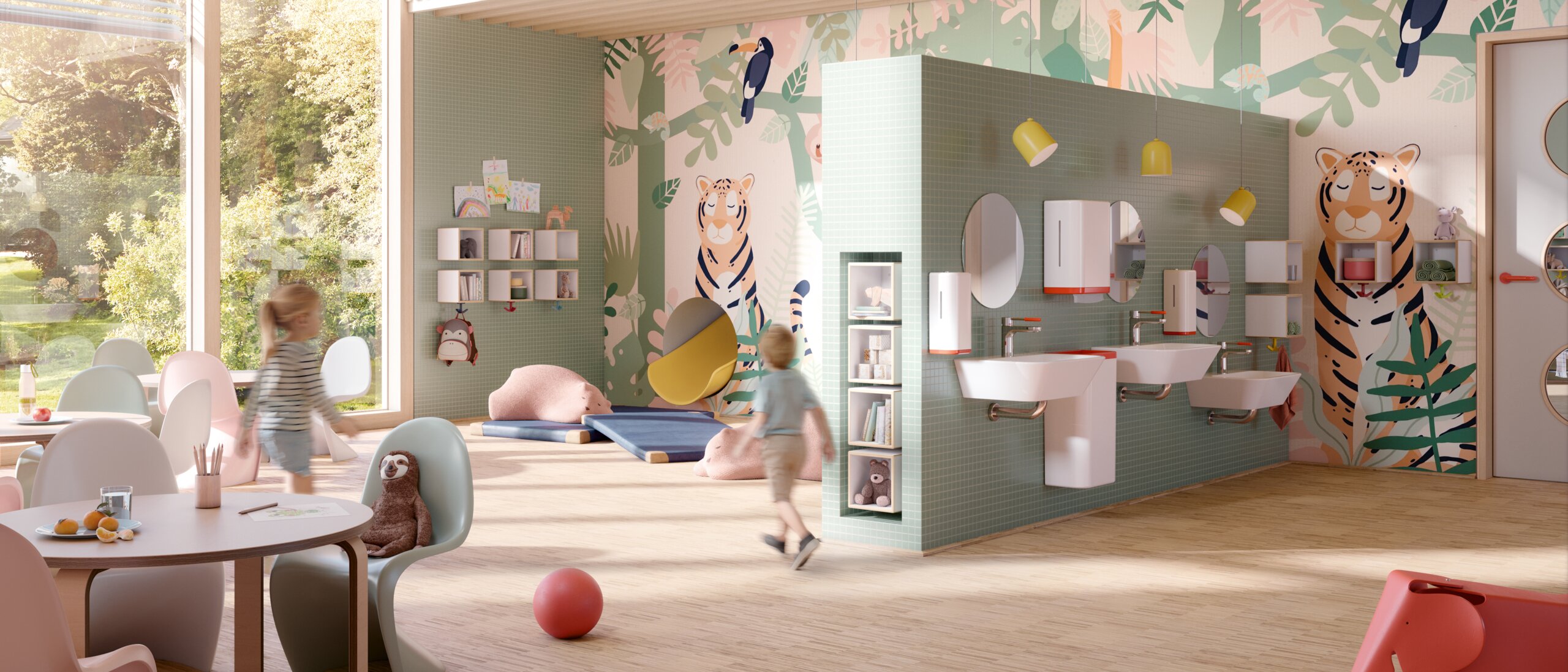 Vollständig ausgestattet sind Sanitäranlagen in Kitas und Kindergärten mit weiteren Spenderlösungen, z. B. für Papier und Mülleimer. Abgerundete Kanten und farbige Rahmenelemente sorgen für mehr Sicherheit und setzen stimmige Farbakzente.