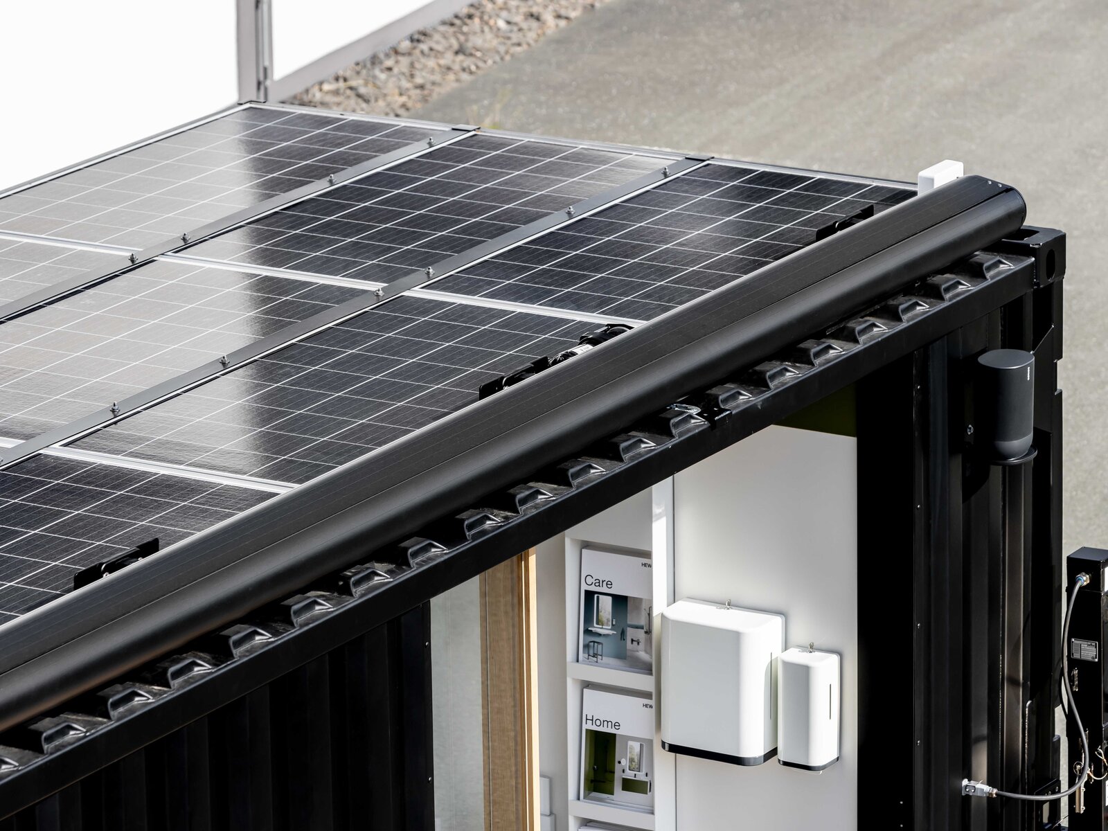 Der Leichtbaucontainer verfügt insgesamt über 15 Quadratmeter sowie über ein nachhaltiges Energiekonzept. Er ist ausgestattet mit vier Batteriespeichern à 2,5 kW. Damit kann er bis zu drei Tage Energie speichern und autark stehen. Die Akkus laden sich mittels Solarpanels auf dem Dach wieder auf. Eine externe Stromquelle ersetzt diese bei schlechtem Wetter. Der Showroom selbst verfügt über ein ausgeklügeltes LED-Beleuchtungssystem, das wenig Energie verbraucht. Selbstverständlich ist der Container barrierefrei und lässt sich bequem per Rampe erreichen.