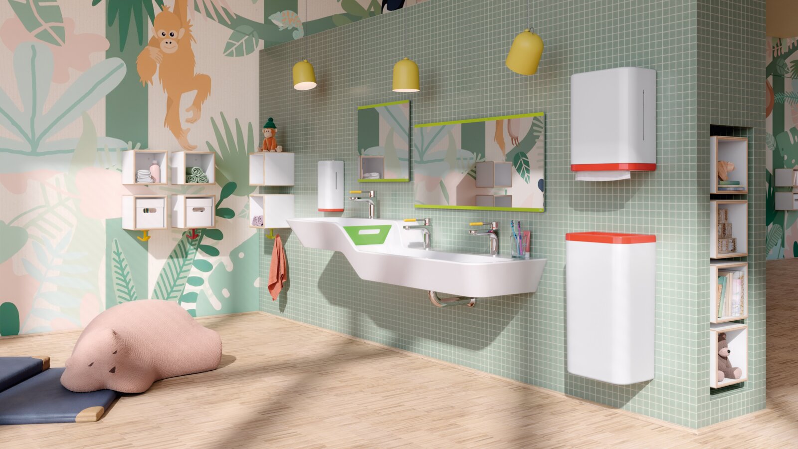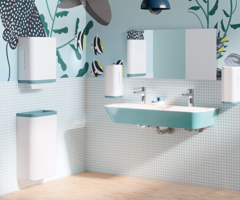 Farbige Waschtische und kindgerechte Motive regen zum Mitmachen an und machen Hygiene zum positiven Ritual.