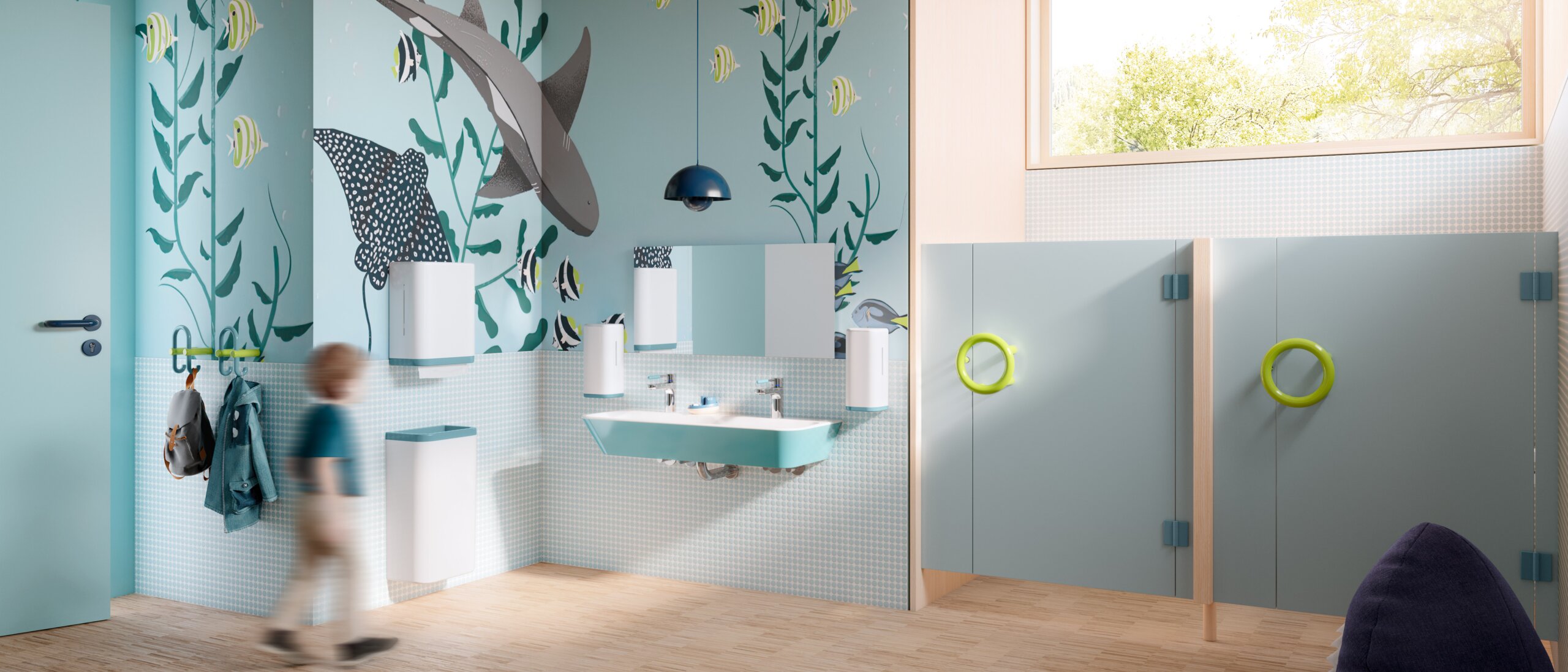 Mit der Serie 477/801 in der Ausführung ICONIC bietet HEWI speziell für Kindergärten und Kindertagesstätten eine Palette freundlicher Farben, die nicht nur funktional, sondern auch ästhetisch überzeugen. Die liebevoll gestalteten Farbkombinationen wie Apfelgrün, Maigrün, Koralle sowie Aquablau und Stahlblau schaffen eine Umgebung, die Kinder anspricht und in der sie sich wohlfühlen. Diese Farbkombinationen fördern nicht nur eine kindgerechte Atmosphäre, sondern unterstützen auch die räumliche Orientierung, indem sie klare und harmonische Akzente im Sanitärbereich setzen.