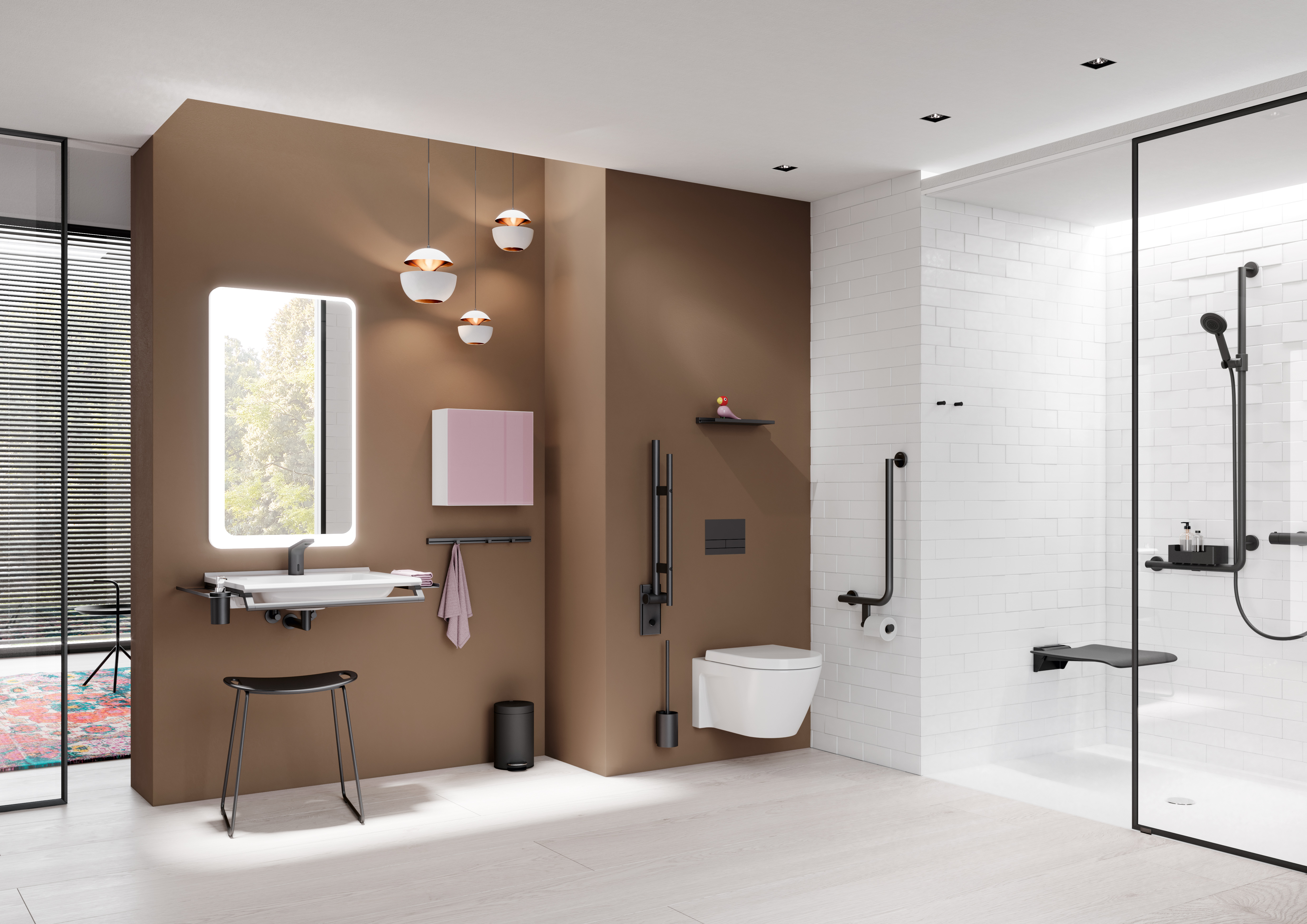 Mit einem umfänglichen Portfolio an Sanitär- und Beschlaglösungen in Schwarz matt bietet HEWI eine durchgehende Gestaltung – von der Tür bis ins Bad.