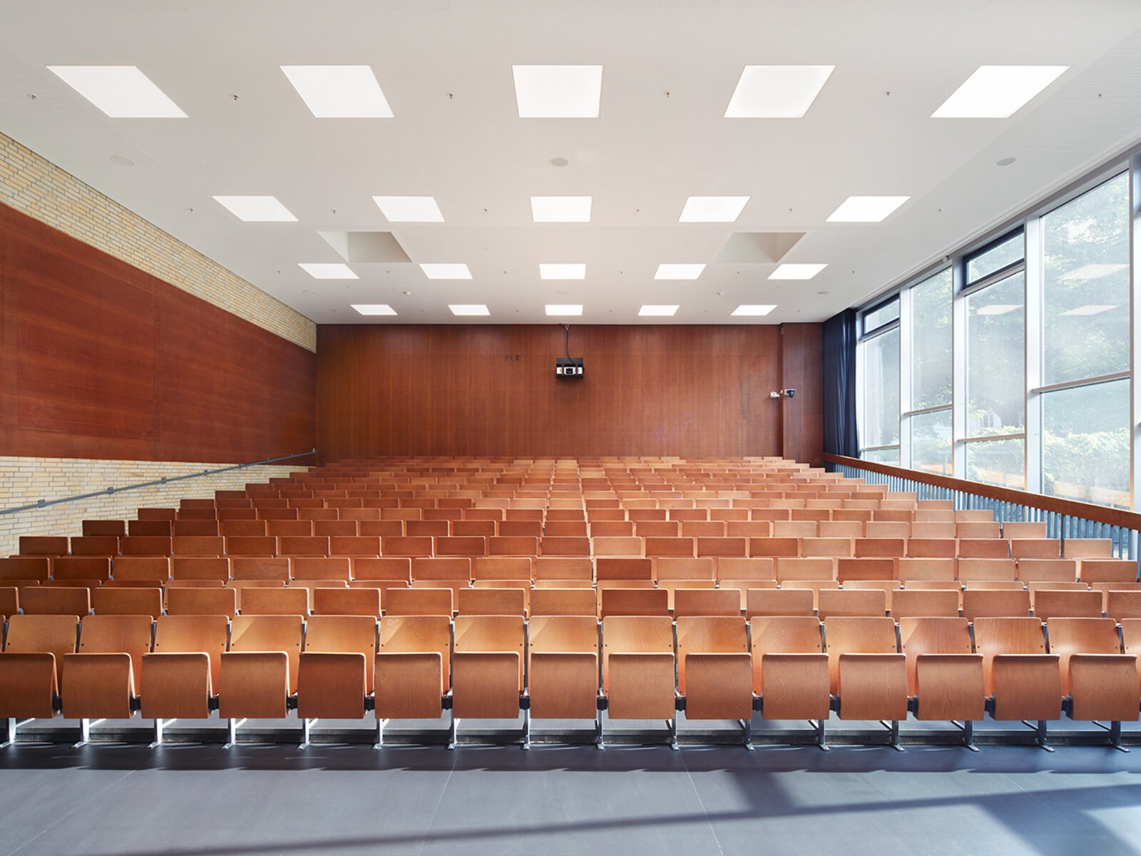 Im „Cube“ wird der lichtdurchflutete Raum im Obergeschoss zusammen mit den vier Sälen im Erdgeschoss neben dem universitären Betrieb auch für interne und externe Veranstaltungen genutzt.