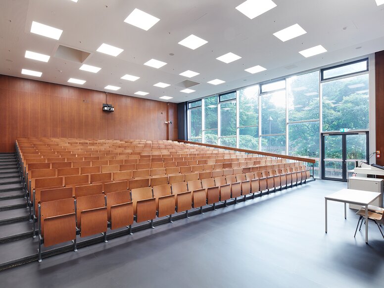 Hörsaal D (Kokoschka Saal). Endlich können die Studierenden der geisteswissenschaftlichen Fächer wieder in den Hörsälen des Philosophenturms lernen.