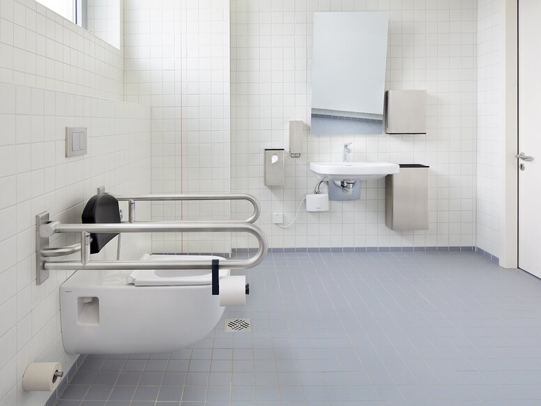 „Insgesamt hat uns auch das Konzept des Universal Designs überzeugt, das die Bedürfnisse aller Nutzenden berücksichtigt und das bei HEWI einen hohen Stellenwert hat", erklärt der Architekt. Besondere Sicherheit bietet zum Beispiel die Kombination aus Rückenstütze und Stützklappgriff, die exakt auf die Bedürfnisse von Menschen mit motorischen Einschränkungen abgestimmt ist.
