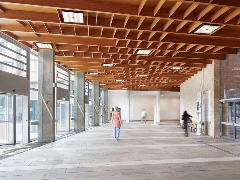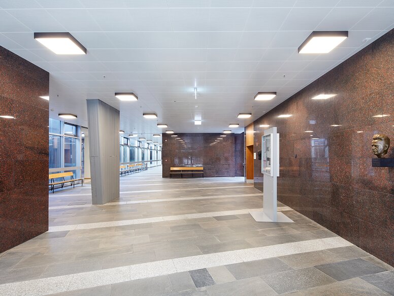 Im denkmalgeschützten Foyer der Hörsäle wurde die Deckenstrahlheizung nach bauzeitlichem Vorbild neu aufgebaut.