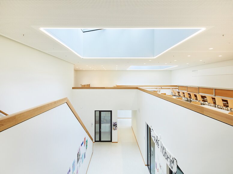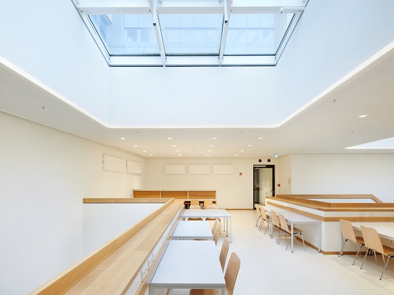 Der Luftraum mit großem Oberlicht unterstreicht die offene, helle und moderne Raumstruktur des neuen Erweiterungsbaus im Innenhof.