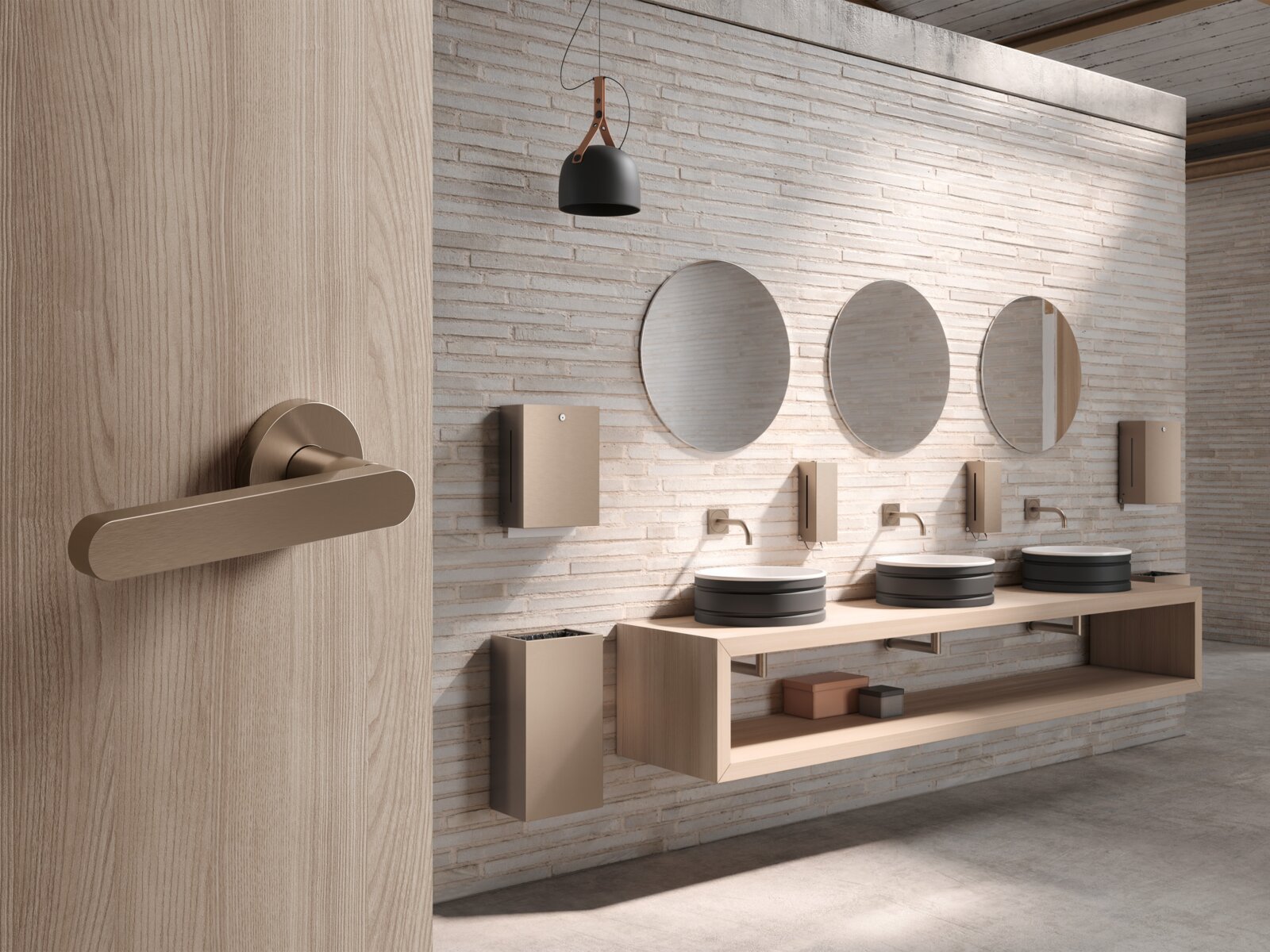 Die Designserie 270 von HEWI erhält ein neues, besonders strapazierfähiges Finish: Der charakteristische Türdrücker ist ab sofort in edlen PVD-Beschichtungen erhältlich – in fünf matt geschliffenen Farbvarianten für anspruchsvolle architektonische Konzepte.