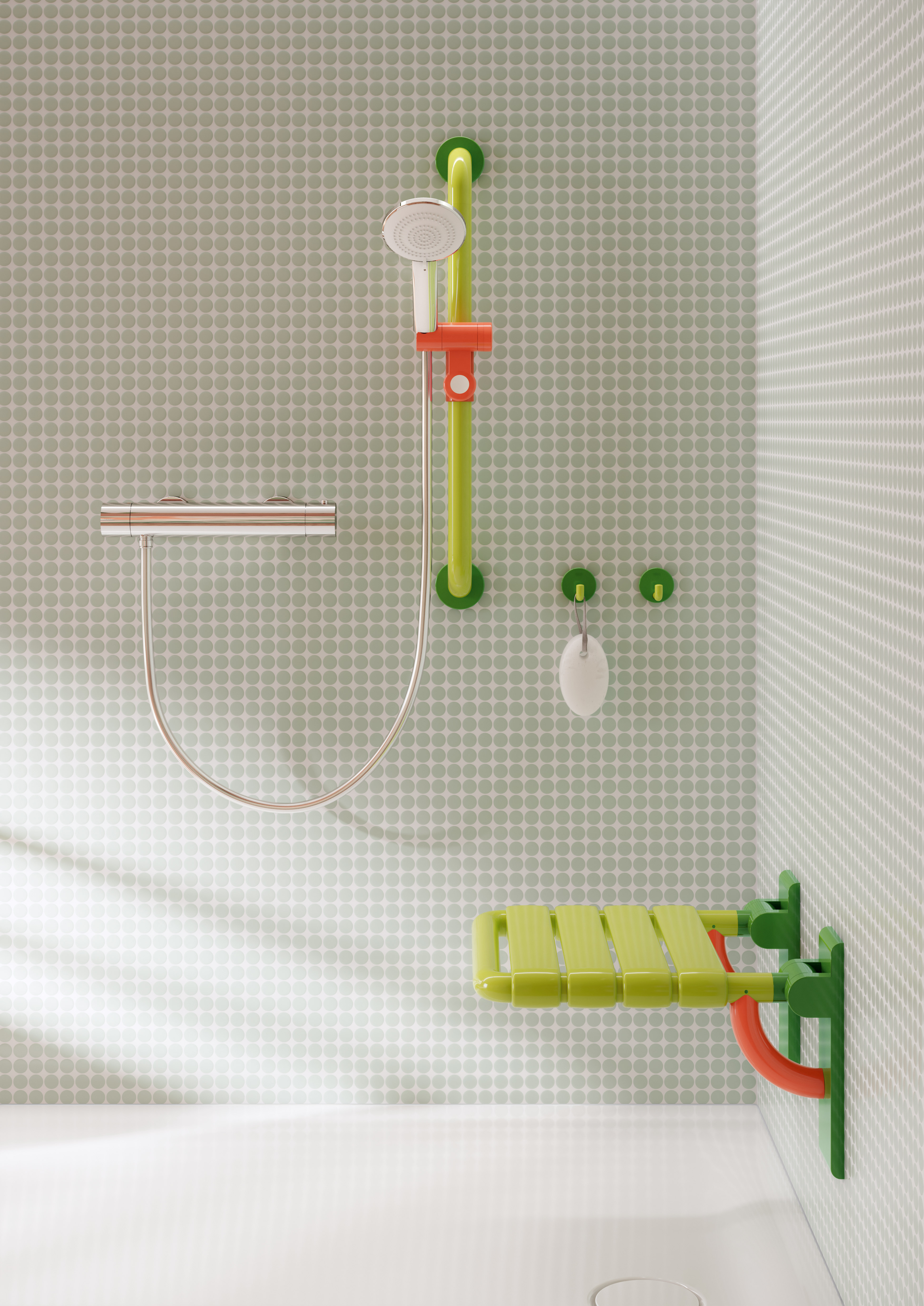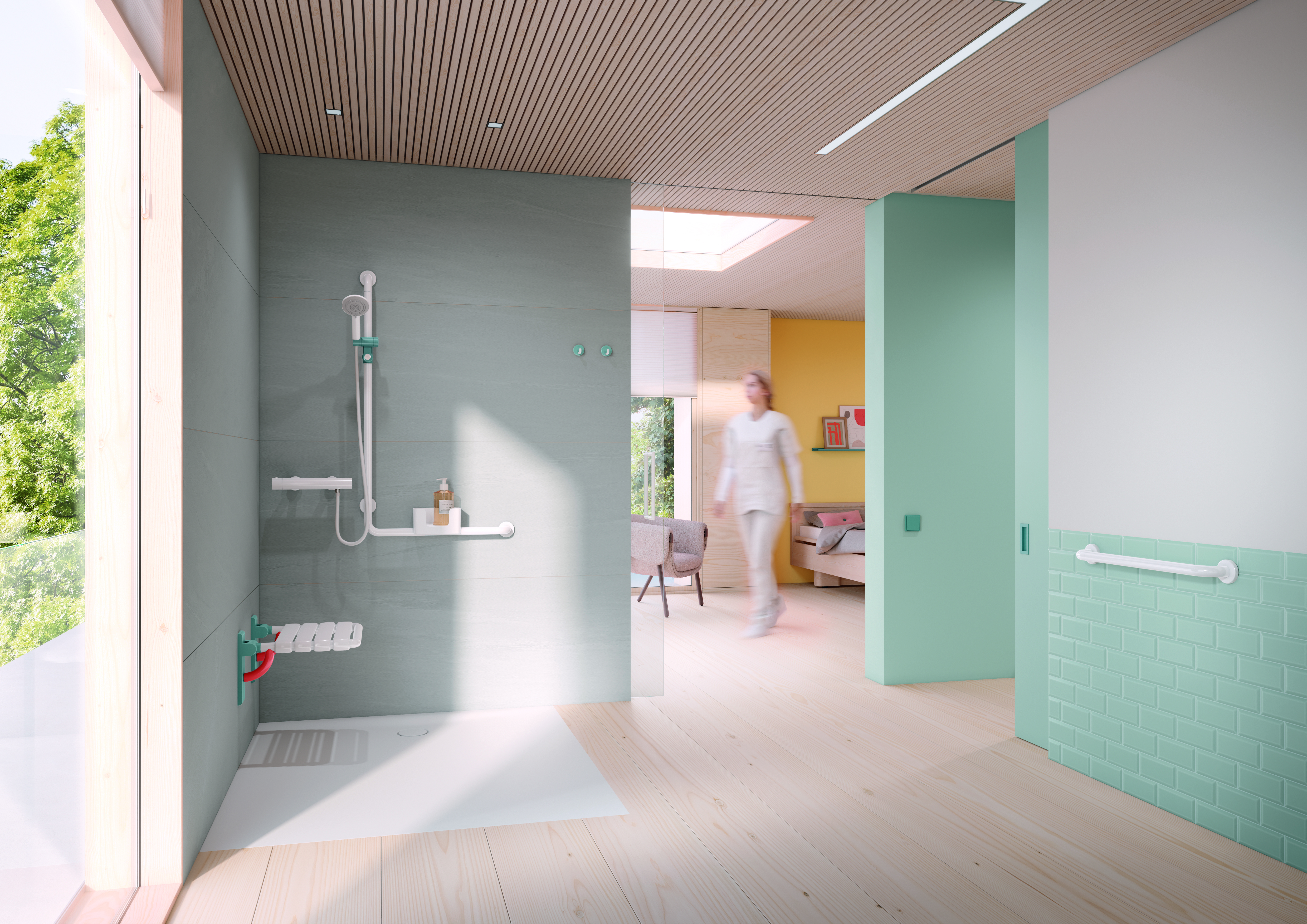 Im Zusammenspiel der unterschiedlichen Komponenten und deren Akzentuierung durch die neue Farbedition Koralle, Aquablau und Reinweiß entsteht im Raum eine Atmosphäre, die anregend und vitalisierend wirkt. Gleichzeitig hat Farbe eine Signalwirkung. Wird ein Produkt durch eine Farbe hervorgehoben, signalisiert der Farbakzent die Nutzung und unterstützt den intuitiven Gebrauch. Das ist ein wichtiger Aspekt, wenn Menschen etwa nicht mehr uneingeschränkt sehfähig sind und beispielsweise durch farblich akzentuierte Produkte eine bessere Orientierung bekommen sollen. Aus all diesen Gründen ist die Tricolor Edition für den Bereich Care, insbesondere Gesundheitsbauten, besonders geeignet.