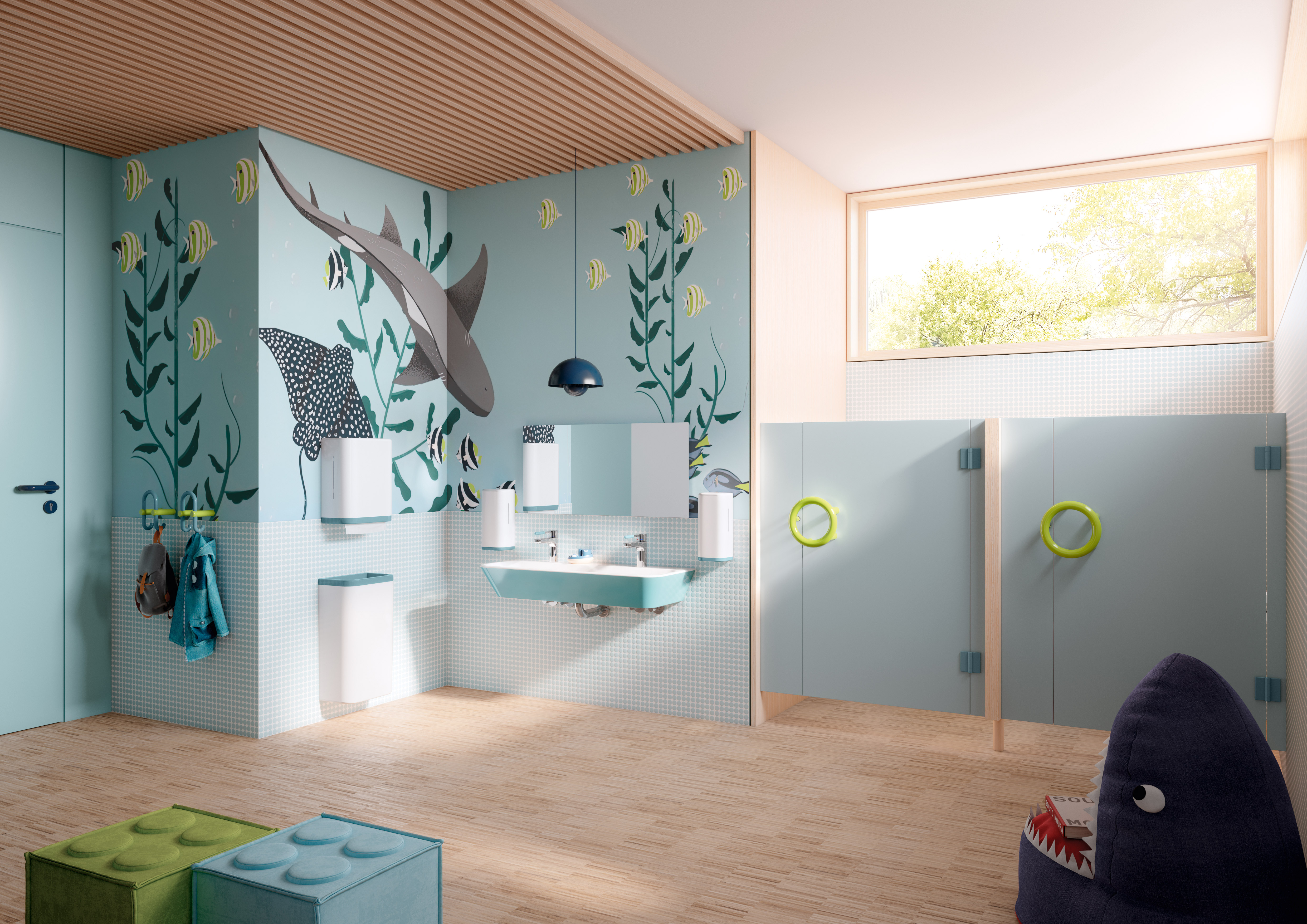 Die auf den Bereich Education – Kindergärten und Kindertagesstätten – zugeschnittenen Farbeditionen wirken mit ihren sanften, naturnahen Tönen freundlich, entspannend und harmonisierend. In diesen Räumen, in denen den ganzen Tag über unter anderem gespielt, Sport ausgeübt und gemeinsam gegessen wird, ist eine gewisse Robustheit und Pflegeleichtigkeit der eingesetzten Materialien gefordert. Ebenso wie in Arztpraxen oder Kliniken, lässt sich kaum vermeiden, dass das Interior Design in Einrichtungen dieser Art eher nüchtern wirkt. HEWI zeigt, dass es auch emotionaler geht. „Das Kind erlebt den Raum anders als ein Erwachsener. Darauf haben sich die Planenden bezüglich der Bemessung der Räume und Bauteile sowie der Einbauten und Einrichtungsgegenstände vor allen Dingen in Sanitärräumen einzustellen“, lautet die Überzeugung der Architektin, Professorin und Verlegerin Natascha Meuser, die sich mit guter Architektur für Bildungsbauten und insbesondere für Kindergärten auseinandersetzt.