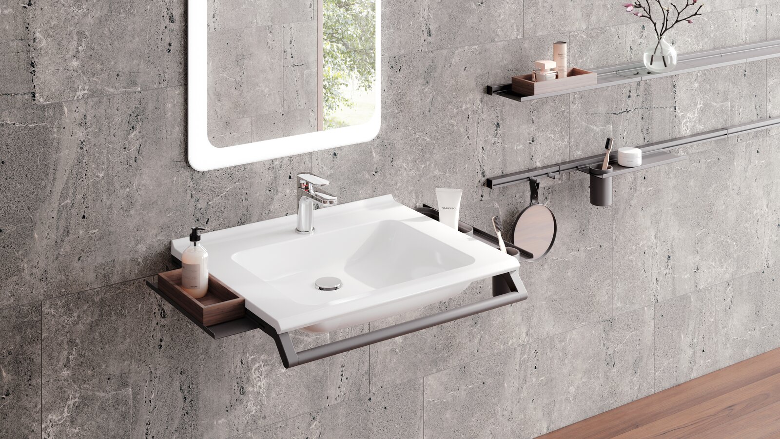 Mit dem modularen Waschtischsystem knüpft HEWI an die Erfolgsgeschichte seiner innovativen Waschtisch-Familie an. Die Waschtische nehmen sich durch die verringerte Materialstärke zurück und können über weitere Produkte mit wichtigen Zusatzfunktionen ergänzt werden. Das innovative Konzept ermöglicht die Integration eines adaptiven Haltegriffs, der auch als Handtuchhalter dient, und eines modularen Ablagesystems direkt am Waschtisch.