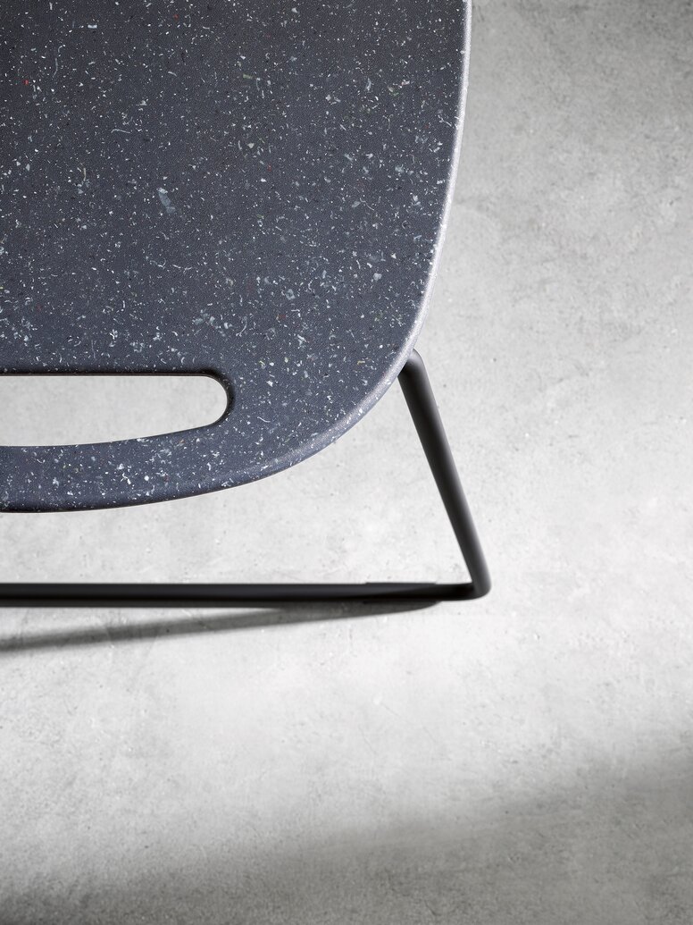 Der besondere Charme liegt für HEWI darin, dass die recycelten Hocker, die aus einem Materialgemisch aus rezykliertem Polypropylen und rezykliertem Polyamid bestehen, nicht nur den Kunststoffabfall verringern, sondern dass jede Sitzfläche und jede Armlehne ein Unikat darstellen. So wirken die leicht melierten Oberflächen mit ihrer jeweils einzigartigen Musterung und durchscheinenden Farbtupfern lebendig und individuell.