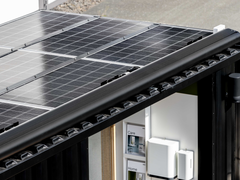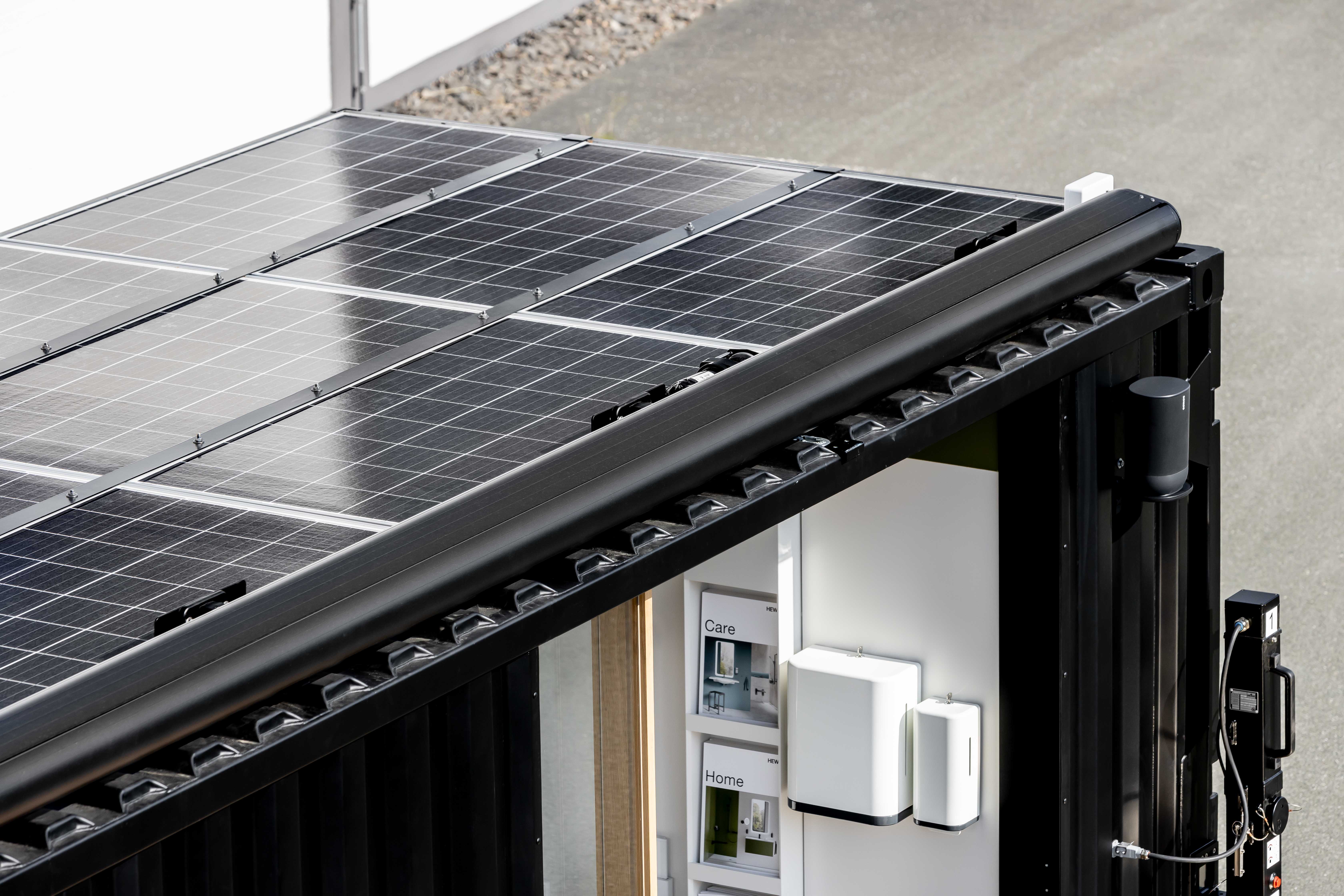 Der insgesamt 15 Quadratmeter große Leichtbaucontainer ist mit einem nachhaltigen Energiekonzept ausgestattet. Technisch ausgerüstet mit vier Batteriespeichern à 2,5 kW, kann der Container für bis zu drei Tage Energie speichern und ist am Standort energieautark. Gespeist werden die Akkus durch die eigenen Solarpanels auf dem Dach des Containers. Bei schlechtem Wetter werden sie durch eine externe Stromquelle ersetzt. Im Inneren verfügt der Präsentationsraum über ein durchdachtes LED-Beleuchtungssystem mit geringem Energieverbrauch. Mit Hilfe von Rampen kann der Container barrierefrei erreicht werden.