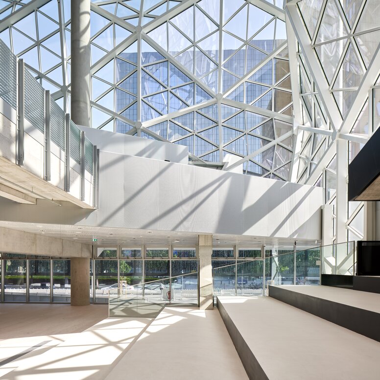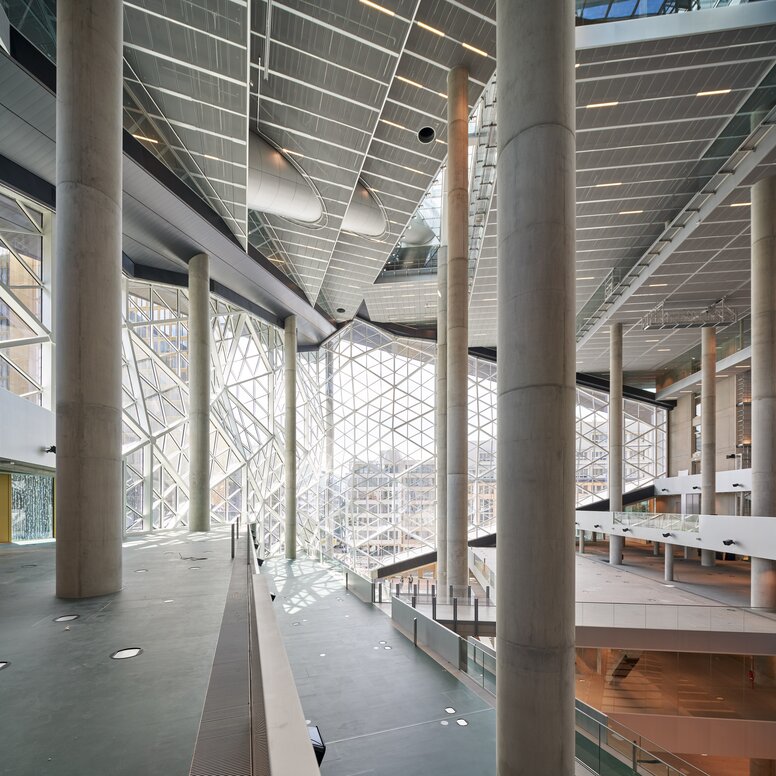 Angemessen opulent und doch nicht aus der Zeit gefallen wirkt dieser Beschleuniger des kulturellen Wandels. Dunkel getönte Glasflächen werden durchbrochen von helleren Elementen in 3-D-Optik. Filigrane Säulen tragen weit auskragende Decken; Brücken, Treppen, Gänge verbinden die verschiedenen Ebenen.