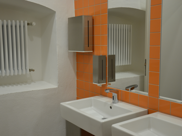 Trotz der umfassenden Restaurierung und Renovierung ist das äußere Erscheinungsbild erhalten geblieben. Im Inneren wurden historische Bereiche aufgearbeitet und mit modernen Elementen kombiniert. Die sanitären Anlagen erfüllten nicht die erforderlichen Vorgaben, sodass sie völlig neu gestaltet werden mussten. Orange geflieste Wände setzen nun farbige Akzente im Sanitärraum. Die Accessoires aus Edelstahl sind besonders pflegeleicht und robust. Die Spendersysteme an Waschtisch und WC erhöhen zudem die Hygiene effektiv – mit ihnen ist die saubere Entnahme von Verbrauchsartikeln wie beispielsweise Seife oder WC-Papier leicht möglich.
