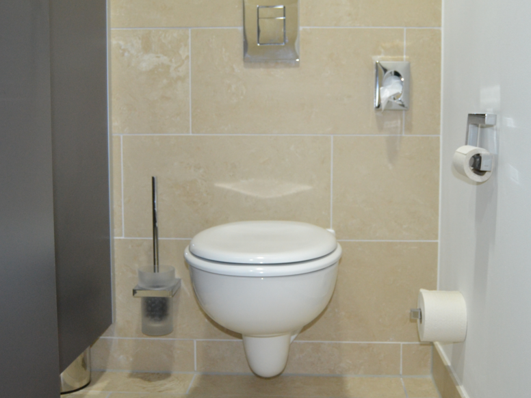 Die vertikale Gliederung der ursprünglichen KPM-Gebäude wird durch die markante Fenstergestaltung aufgenommen. Die klare Linienführung setzt sich im Inneren des Neubaus fort. Für die Ausstattung der Sanitärräume wurde System 100 von HEWI gewählt.