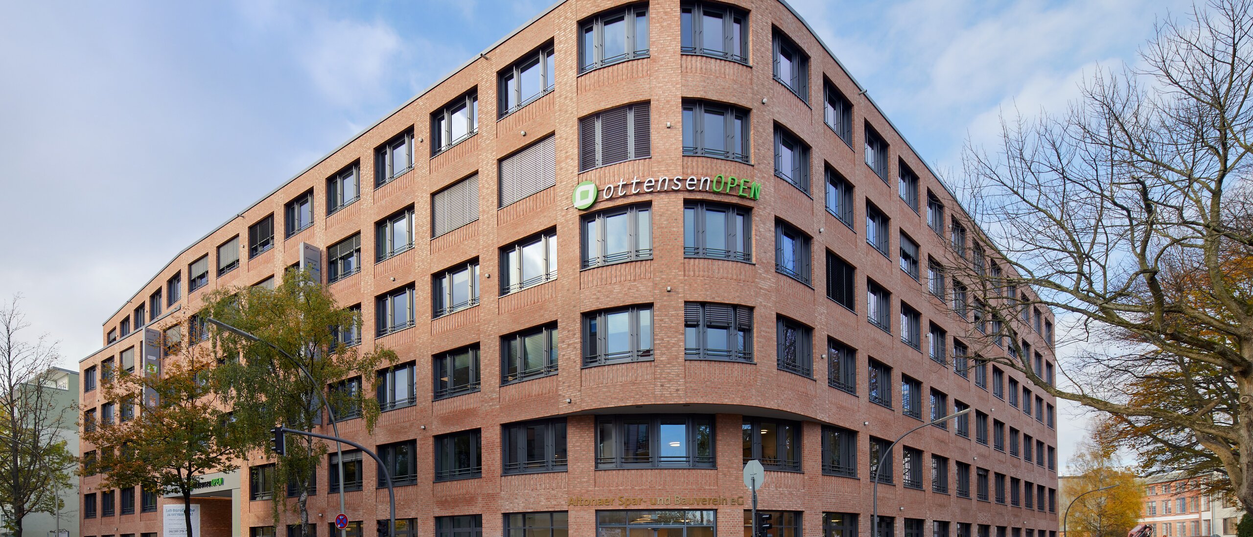 Das ottensenOpen strahlt eine Mischung aus Ruhe und Spannung aus. Die abwechslungsreiche und spannungsvolle Kubatur des Gebäudes mit ihren Rücksprüngen und Rundungen kombinierten die Architekten mit einer regelmäßigen und ruhigen Fassadenaufteilung. Gleichzeitig fügt sich das Bürogebäude äußerst harmonisch in die umgebende Architektur Ottensens ein, die vorwiegend aus Altbauten besteht. Das sechsgeschossige Gebäude greift die Bestandhöhen der benachbarten Häuser auf. Um die optische Integration in die Bestandsbebauung zusätzlich zu verbessern, schufen die Architekten einen Rücksprung im fünften Obergeschoss in Höhe der Traufkanten der anschließenden Gebäude. Auf der Rückseite des ottensenOpen bildet der fünfgeschossige Baukörper die moderne Form eines Gewerbehofs. Der Innenhof wird durch eine Durchfahrt von der Barnerstraße aus erreicht.