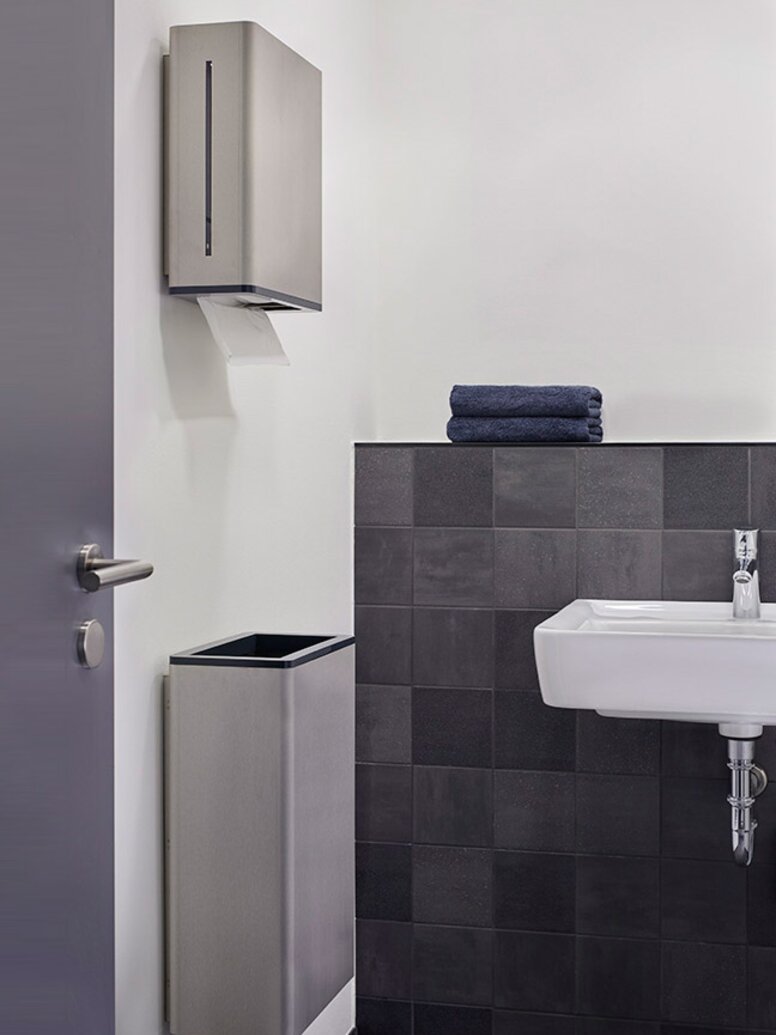 Die Architekten wählten für die barrierefreien Sanitärräume die Serie 805 von HEWI. Das reduzierte Design von Serie 805 ermöglicht eine klare Rauminszenierung. Bis ins kleinste Detail zeigt sich bei dieser Serie, dass gutes Design und intelligente Funktionen eine Einheit bilden. So ist der Funktionsbereich der Spendersysteme aus hochwertigem Polyamid farbig abgesetzt.