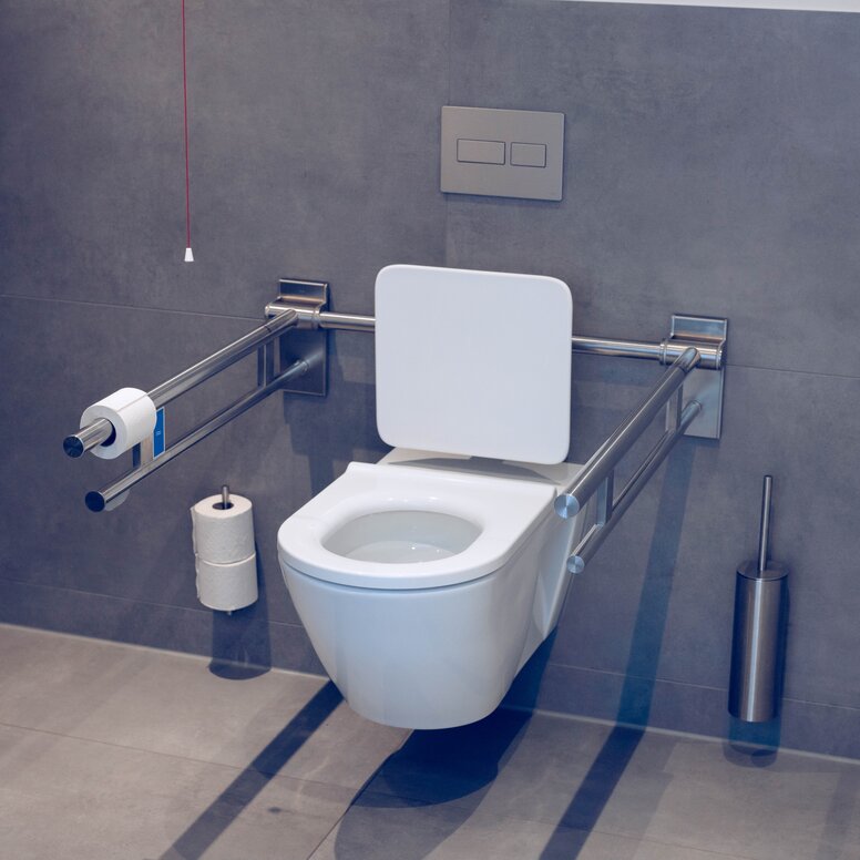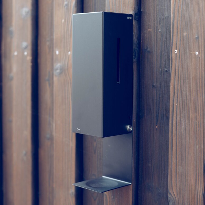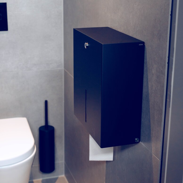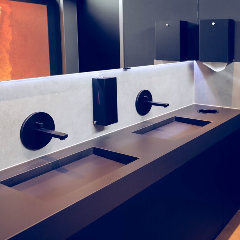 Passend zu den schwarz-matten HEWI Türbeschlägen, aber auch zu den schwarzen Waschtischarmaturen und dunklen Oberflächen in den neuen Sanitärbereichen, fiel die Wahl zudem auf die langlebigen und robusten Accessoires aus dem HEWI System 900: Seifenspender in der Variante HEWI Sensoric, Papierhandtuchspender, Abfallbehälter und WC-Bürstengarnituren kommen zum Einsatz, alle gefertigt aus hochwertigem Edelstahl und in edlem Schwarz tiefmatt pulverbeschichtet. Das System 900 erfüllt die Anforderungen verschiedenster Gebäudetypologien, besonders an stark frequentierten Orten wie öffentliche Gebäude und Restaurants, und überzeugt durch Funktionalität, dauerhafte Qualität, clevere Montagetechnik und eine hygienische Gestaltung. Ebenso aus der Serie 900, die im Kern für barrierefreie Bäder entwickelt wurde, stammt der Stützklappgriff im WC, der mit seiner verlässlichen Qualität und seinen ausgereiften technischen Details überzeugt.