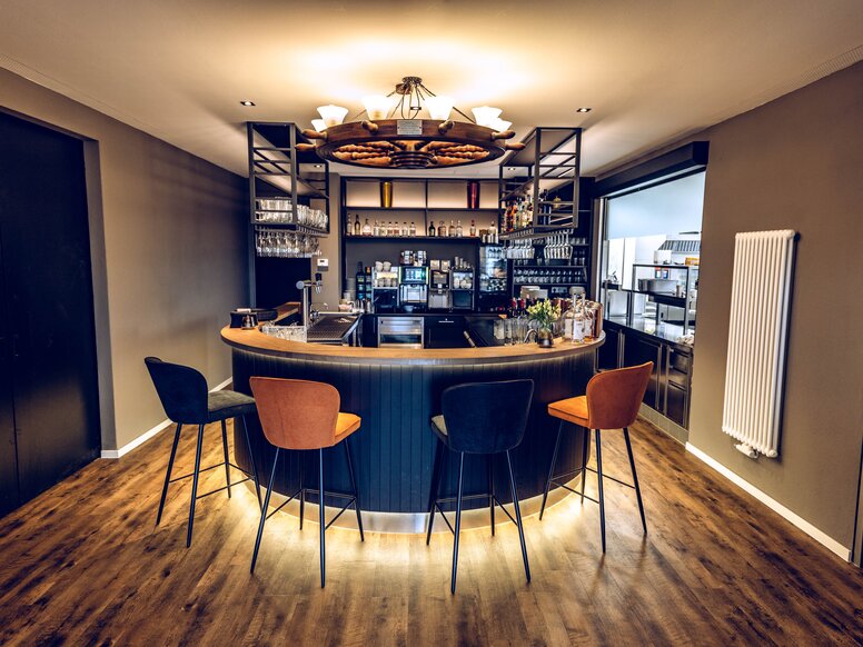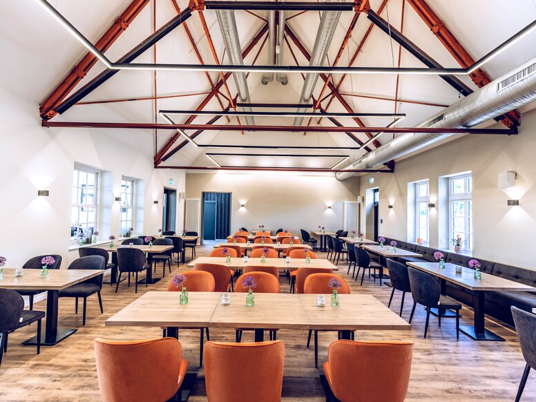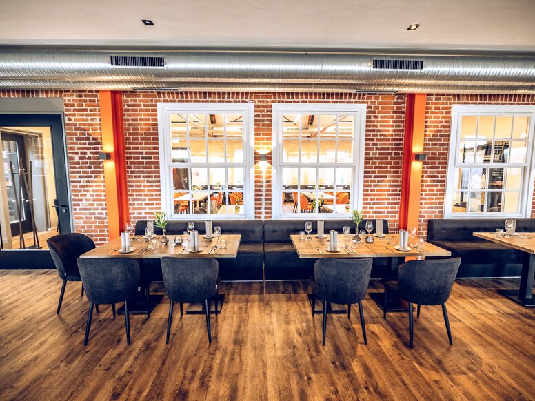Im Innenraum sind viel Backstein und schwarze Möbel, Einbauten und Türen präsent, was der Gaststätte einen edlen Industrie-Look verleiht.