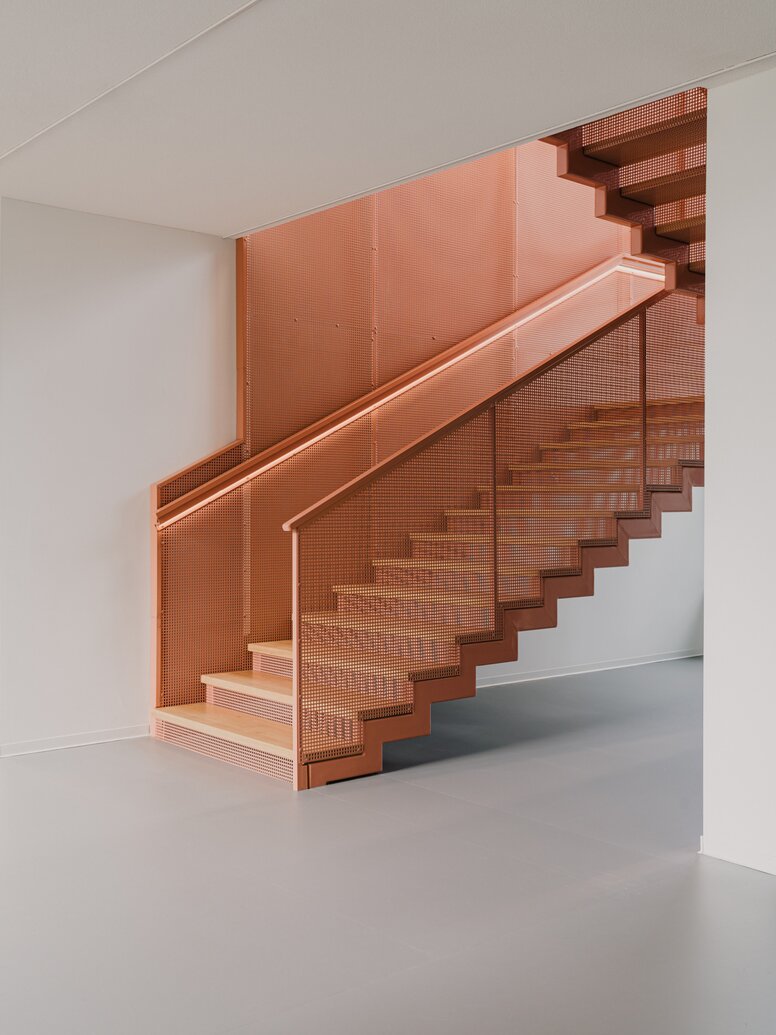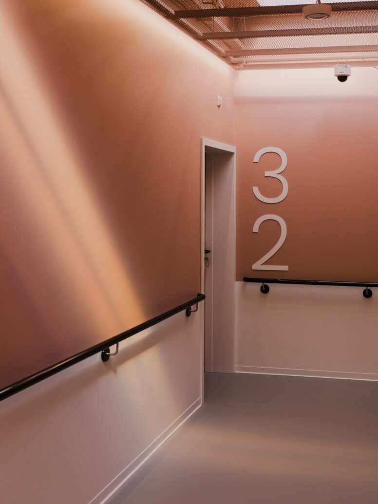 In Anlehnung an die Forschungsansätze sehen die Patientenzimmer viel Raum zur individuellen Gestaltung durch persönliche Bilder und Gegenstände vor, um die Gedächtniszentren im Gehirn zu stimulieren. In der Innenraumgestaltung finden sich zudem immer wieder Verknüpfungen zum Design der 1960er und -70er Jahre. Die Anregung der Erinnerung trägt nicht nur zum persönlichen Wohlbefinden bei, sie fördert auch die Anpassung an die neuen Zimmer und die räumliche Orientierung der alten Menschen im Gebäude. Unterstützt wird dies durch die Unterteilung des Gebäudes in verschiedene Farbzonen. Der gezielte Einsatz von Farben und Farbkontrasten an Treppen, Türen und Funktionselementen fördert zudem die intensivere Wahrnehmung von Menschen mit Sehbehinderung oder Demenz.