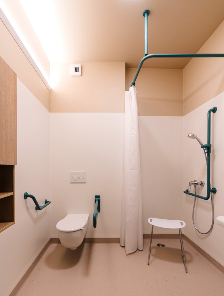 Mit HEWI und ENTRO konnten die Architekten ihren innovativen und kreativen Ansatz bis ins Detail überzeugend umsetzen und ein Ambiente schaffen, das Wohlbefinden und Genesung fördert und eingeschränkten Menschen ein Maximum an Eigenständigkeit und Selbstbestimmtheit ermöglicht.