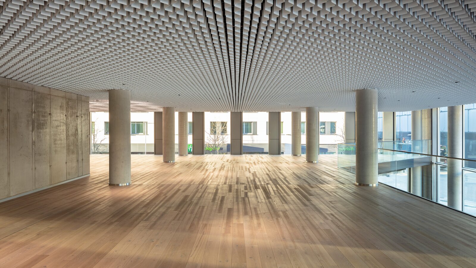 Die überwiegend gläserne Haut entfaltet auch im Innern ihre Wirkung: Eröffnet sie doch durch großformatige, bodentiefe Fensterflächen den atemberaubenden Blick über die gesamte Stadt und sorgt mit viel Tageslicht für eine freundliche und offene Loft-Atmosphäre. So finden die rund 2.500 Mitarbeiter im Stream Tower Arbeitsbedingungen vor, die viel Raum für Inspiration, Kommunikation und Innovation bieten. Die Prinzipien Klarheit und Materialreduktion setzen sich ebenfalls fort: Der Gebäudekern mit Erschließung über Aufzüge und Treppen ist in Sichtbeton gehalten, erlesene schwarz-weiße Terrazzoböden vereinen Eleganz mit ausgesprochener Robustheit.