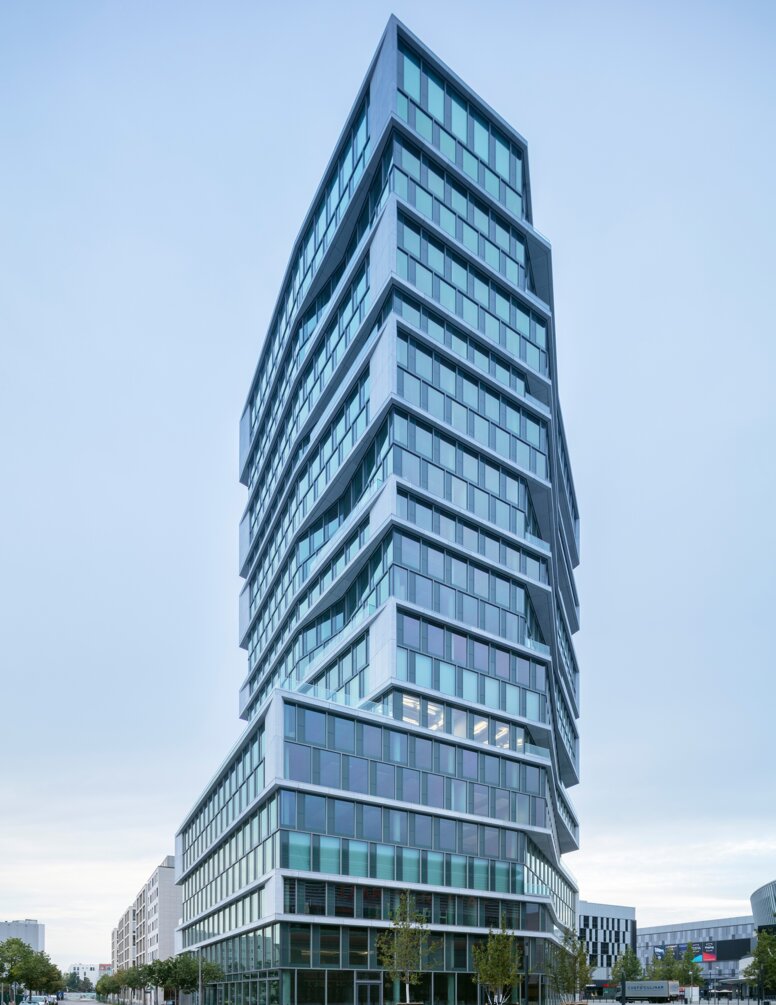 Aus einer Art gläsernen Sockel von sieben Geschossen schiebt sich der Turm Stockwerk für Stockwerk alternierend versetzt 97,5 Meter zu „einer interessanten, stadträumlichen Skulptur“, wie ihn Gewers Pudewill nennen, in Richtung Himmel. Die dynamischen Vor- und Rücksprünge in der Fassade formen große Balkone und Terrassen auf allen Ebenen aus. Mäandernde, horizontale Sichtbetonbänder strukturieren das Gebäude und setzen einen interessanten Akzent. Die gläserne Hülle lässt den Turm aus jeder Blickrichtung und je nach Sonnenstand in einem anderen Licht erscheinen und unterstreicht damit seine lebendige und vielschichtige Kubatur.