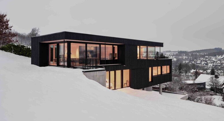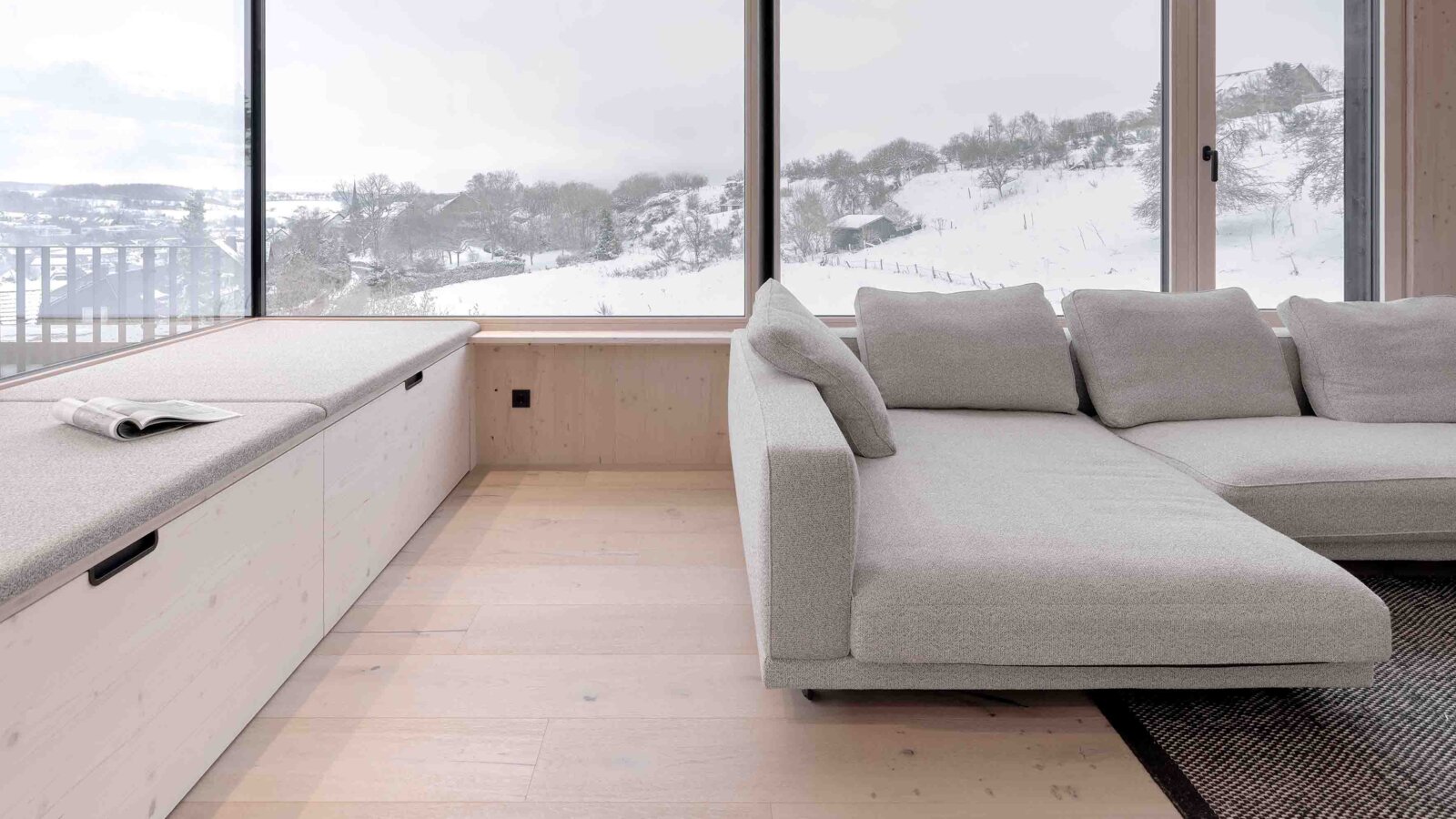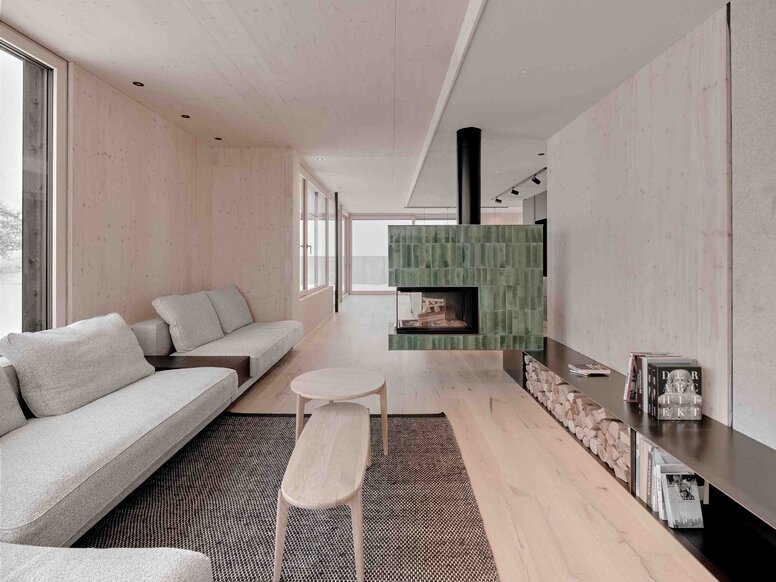 The architectural concept is based on the dialogue of the materials. Exposed concrete as a foundation is durable, load-bearing and robust. This contrasts with the warm wood of the upper floors, which symbolises lightness, openness and a closeness to real, everyday life. “These contrasts are not a contradiction: they are the real strength of the house,” emphasises Schönauer. In this interplay, an architecture unfolds that radiates both solidity and transparency. Large-format glass panes, precisely positioned vistas and a window seat with a panoramic view interweave the interior closely with the landscape. Inside and outside form a flowing continuum