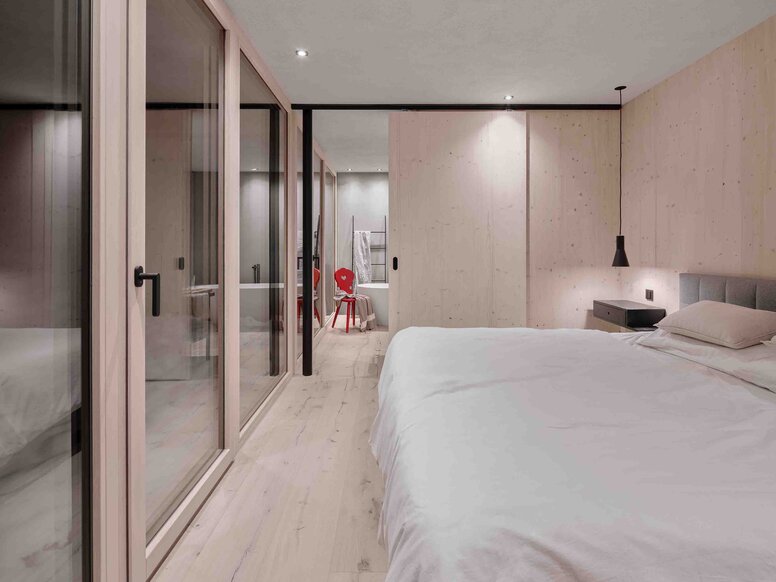 The property is located at the transition from an established village structure to an open landscape. Here, the terrain rises steeply, creating a component that is as complex as it is inspiring. Instead of levelling the terrain, the architecture responds to the existing topography: Two solid base storeys made of exposed concrete absorb the differences in height, accommodate circulation and functional spaces and convey a sense of earthiness and calm with their introverted presence. On top of this, two lighter storeys in a solid cross-laminated timber (CLT) construction open up to the surroundings. “It’s not about opposing the landscape, rather about absorbing its power,” explains Schönauer. This creates a clear spatial graduation: restrained and protected at the bottom, open, bright and expansive at the top.