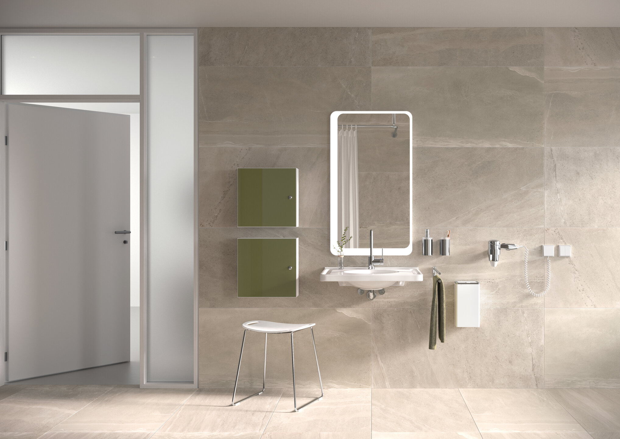 Der Spiegel über dem Waschtisch muss sowohl für eine sitzende als auch für eine stehende Person einsehbar sein – dies ist besonders leicht mit einem Spiegel der bis zum Waschtisch reicht umzusetzen. Bei der Beleuchtung ist darauf zu achten, dass sie möglichst blendfrei ist.